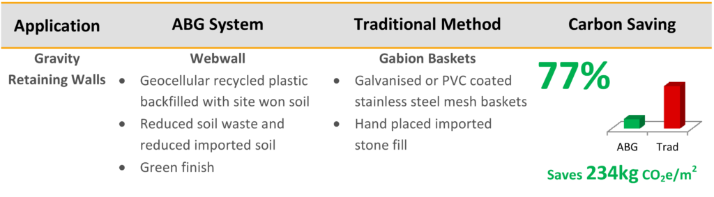 The use of ABG Webwall Geocell can save up to 77% on carbon footprint compared with traditional gabion basket gravity retaining walls: